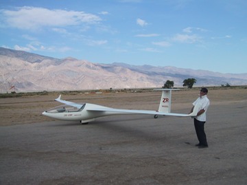 DG600 at Lone Pine airport with Neville Robinson holding a wingtip.